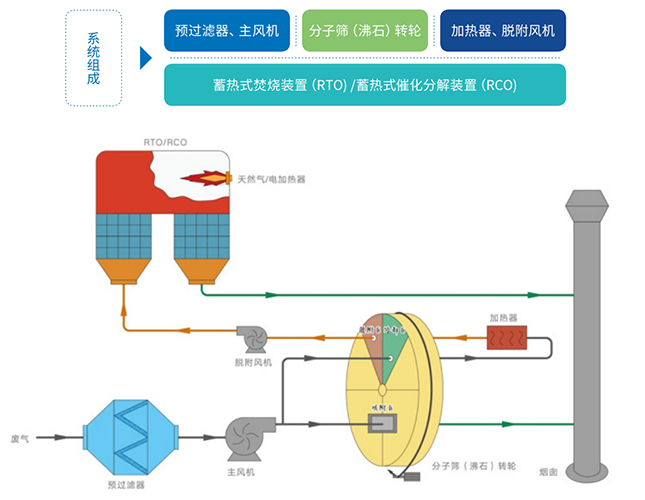 轉(zhuǎn)輪吸附材料是可以吸附有機(jī)溶劑的疏水性分子篩。轉(zhuǎn)輪分為3個(gè)區(qū)域即吸附區(qū)、脫附區(qū)和冷卻區(qū),在電機(jī)帶動(dòng)下旋轉(zhuǎn),可實(shí)現(xiàn)吸附、脫附、再生的連續(xù)工作。在吸附凈化排出潔凈空氣的同時(shí),完成脫附與RTO/RCO的燃燒處理過(guò)程。