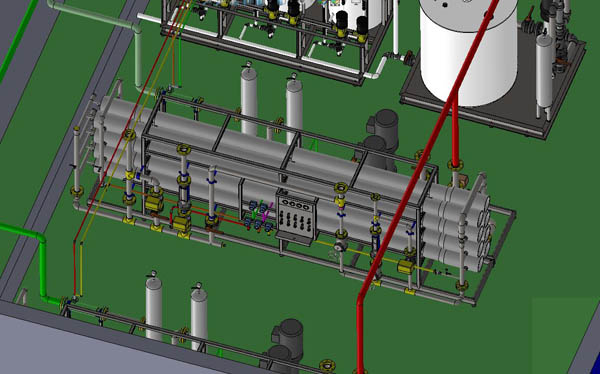 本項(xiàng)目設(shè)計(jì)總產(chǎn)水量50 m3/h(處理系統(tǒng)采用平行的兩套系統(tǒng),加藥及控制系統(tǒng)一套),產(chǎn)水率不低于65%。新增回用水深度處理系統(tǒng),選用低壓反滲透設(shè)備,對(duì)MBR池出水進(jìn)行深度處理。系統(tǒng)采用保安過(guò)濾器-反滲透系統(tǒng)。從回用水箱取水,通過(guò)反滲透系統(tǒng)后,濃水通過(guò)總排放口進(jìn)行排放,反滲透出水端流入本項(xiàng)目?jī)?nèi)新增的100m3不銹鋼產(chǎn)水箱及配套水泵到使用點(diǎn),進(jìn)水和出水分別與回用水箱和聯(lián)合站房水池水位聯(lián)動(dòng)。