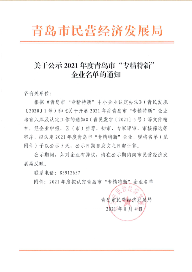 根據(jù)《青島市“專精特新”中小企業(yè)認定辦法》(青民發(fā)規(guī)【2020】1號)和《關(guān)于開展2021年度青島市“專精特新”企業(yè)培育入庫及認定工作的通知》(青民發(fā)字【2021】5號)等文件精神,經(jīng)企業(yè)申報、區(qū)(市)推薦、初審、專家評審、審核篩選等程序,青島國標環(huán)保有限公司和國標子公司-青島弘毅勤環(huán)??萍加邢薰就瑫r被認定2021年度青島市“專精特新企業(yè)”。