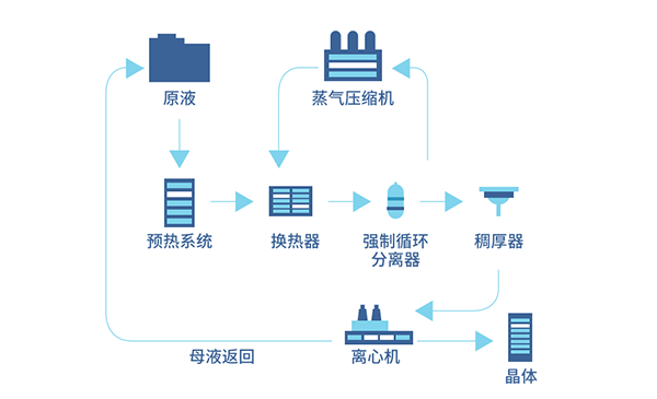 MVR原理是利用蒸汽壓縮機(jī)壓縮蒸發(fā)產(chǎn)生的二次蒸汽,提高二次蒸汽熱量和溫度,壓縮后的蒸汽打入蒸發(fā)器作為熱源,再次使其原液產(chǎn)生蒸發(fā),從而達(dá)到不需要外部鮮蒸汽,依靠蒸發(fā)器系統(tǒng)自循環(huán)來達(dá)到蒸發(fā)濃縮的目的。比傳統(tǒng)蒸發(fā)器節(jié)省70%左右的能源,節(jié)省80%以上的冷凝水,減少50%以上的占地面積。